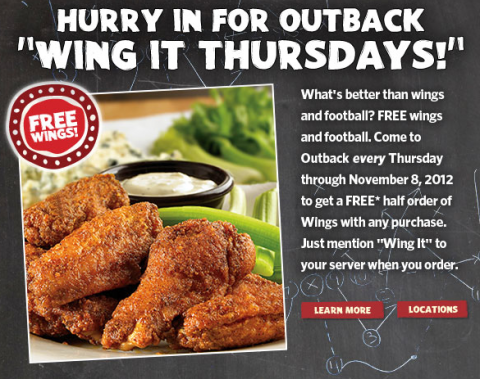 EVERY Thursday until November 8th you can get 1/2 price wings at Outback Steak House. All you have to do is mention “Wing It” to your server. No COUPONS needed!