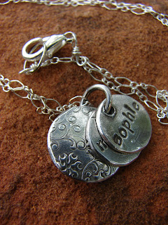 This is the necklace that I made for Shelly, I think it turned out darling. A larger patterned disk is the backdrop for two smaller disks with her girls names on them. It is perfect to wear everyday, not too big and not too small. I normally antique my pieces quite a bit as I like the old look, but my sister convinced me to only do the disks on this one and I love how it looks. Besides, it will naturally tarnish a bit over time.