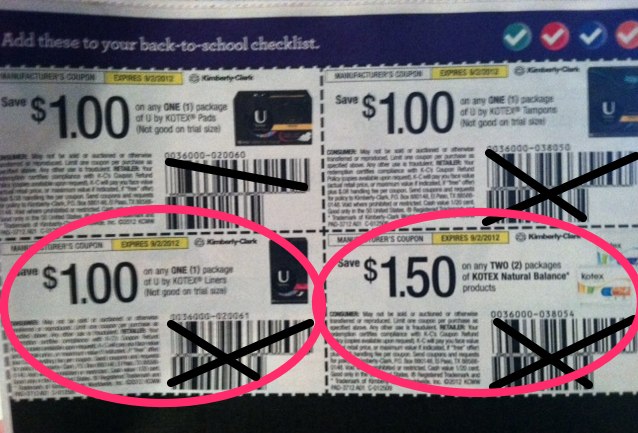 BUT, you can use them on the regular 24ct. Kotex U packs in the regular Women’s section of the store. These are priced at $1.24 a pack.